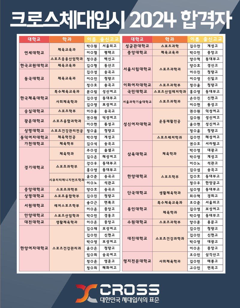 모든 학생들의 운동실기 및 지도, 테스트 영상 등을 활용하여 강사진들과 학생들의 노력으로 이뤄낸 합격자 명단입니다.